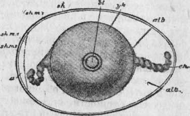Помимо скорлупы, интерес представляет и белок. Он, конечно, служит для питания зародыша, но употребляется лишь на поздних стадиях развития и с успехом мог бы быть заменен добавочным количеством желтка, если бы главное его назначение не было совершенно иное, — именно, чисто механическое. Он служит как бы эластичным буфером между твердой скорлупой и нежным зачатком, развивающимся на верхнем полюсе желтка. Когда зародыш вырастет и окрепнет настолько, что толчки и сотрясения ему не опасны, белок становится ненужным и потребляется в пищу.