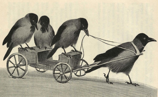 Ворона моментально вынимает голову из хомутика и устремляется к блюдечку. Напрасно: я снова отнимаю блюдечко, и пернатая лошадка ничего не получает, пока не впрягается в коляску.