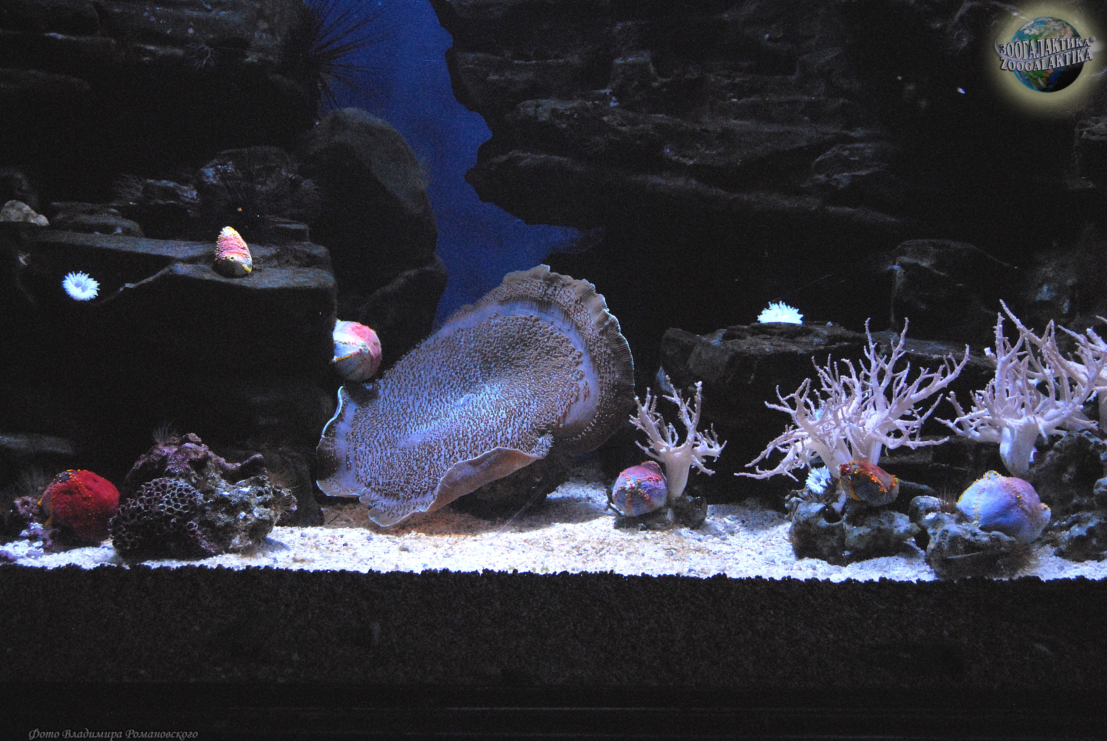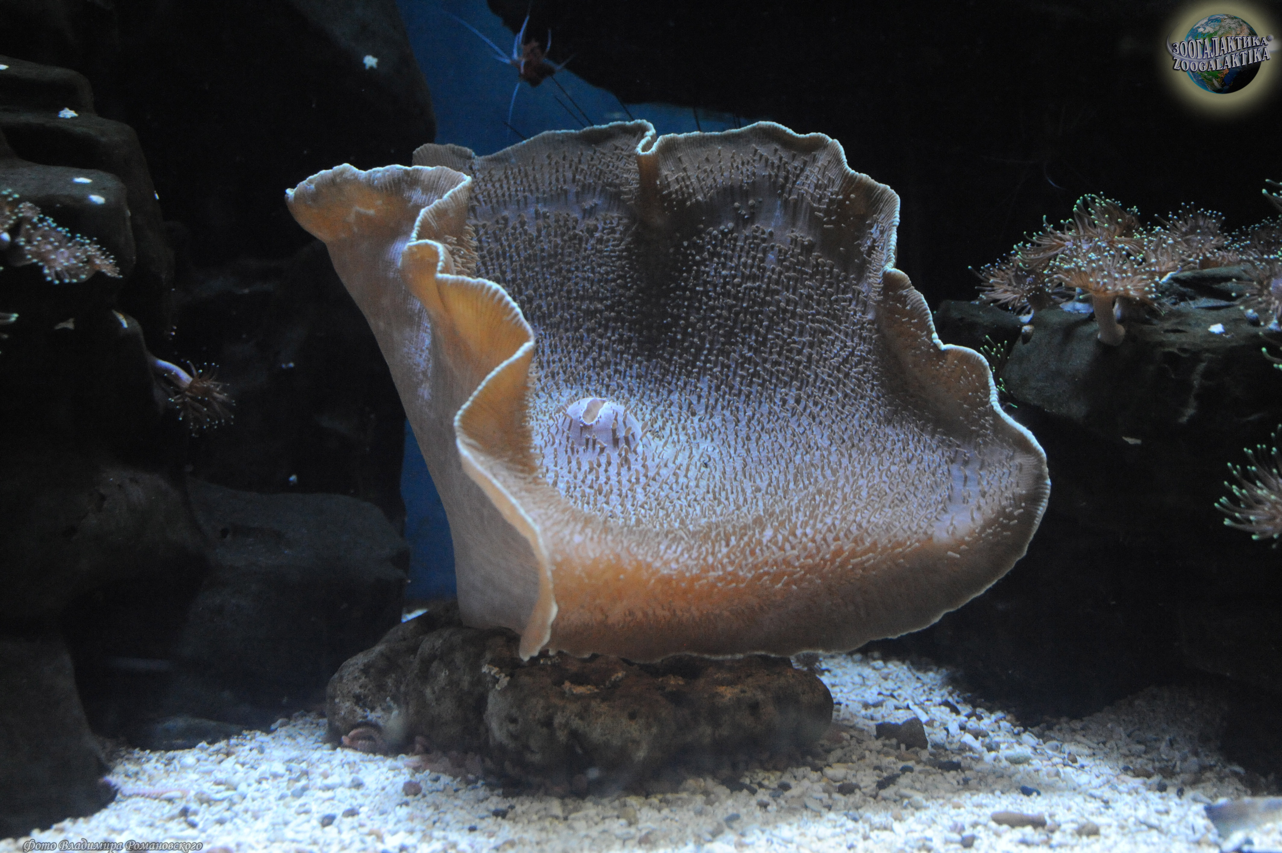 Этих гигантов среди дискоактиний называют "слоновые уши" или "гигантские грибы". Широкий ротовой диск этих актиний покрыт небольшими вытянутыми щупальцами, в центре диска располагается сравнительно крупное ротовое отверстие. Окраска у них очень разнообразная: сиреневая, фиолетовая, зеленая, коричневая и т.д., максимальный размер - до 40 см в диаметре. Распространены слоновые уши в Западной части Тихого океана, в акватории островов Индонезии и на Большом Барьерном Рифе, где населяют мелководные участки коралловых рифов. Держатся «уши» преимущественно на отмерших мадрепоровых кораллах, каменистых участках или реже на песчаном дне. Эти поражающие воображение организмы – хищники. Зоологи предполагают, что они используют одурманивающий запах для привлечения рыб. Когда ничего не подозревающая жертва приближается к полипу вплотную, актиния захватывает ее, смыкая края ротового диска. Ловушка медленно закрывается вокруг рыбы, как бы заключая ее в огромный шар, и у жертвы практически не остается шансов на спасение. Рыба умерщвляются стрекательными клетками, а затем переваривается. Кроме того, значительную часть питательных веществ амплексидискусы получают другим способом: от симбиотических зооксантелл. Однако для нормального роста и развития при содержании в аквариуме им необходимы регулярные подкормки зоопланктоном, мелко нарубленным мясом креветок, моллюсков или рыбы.