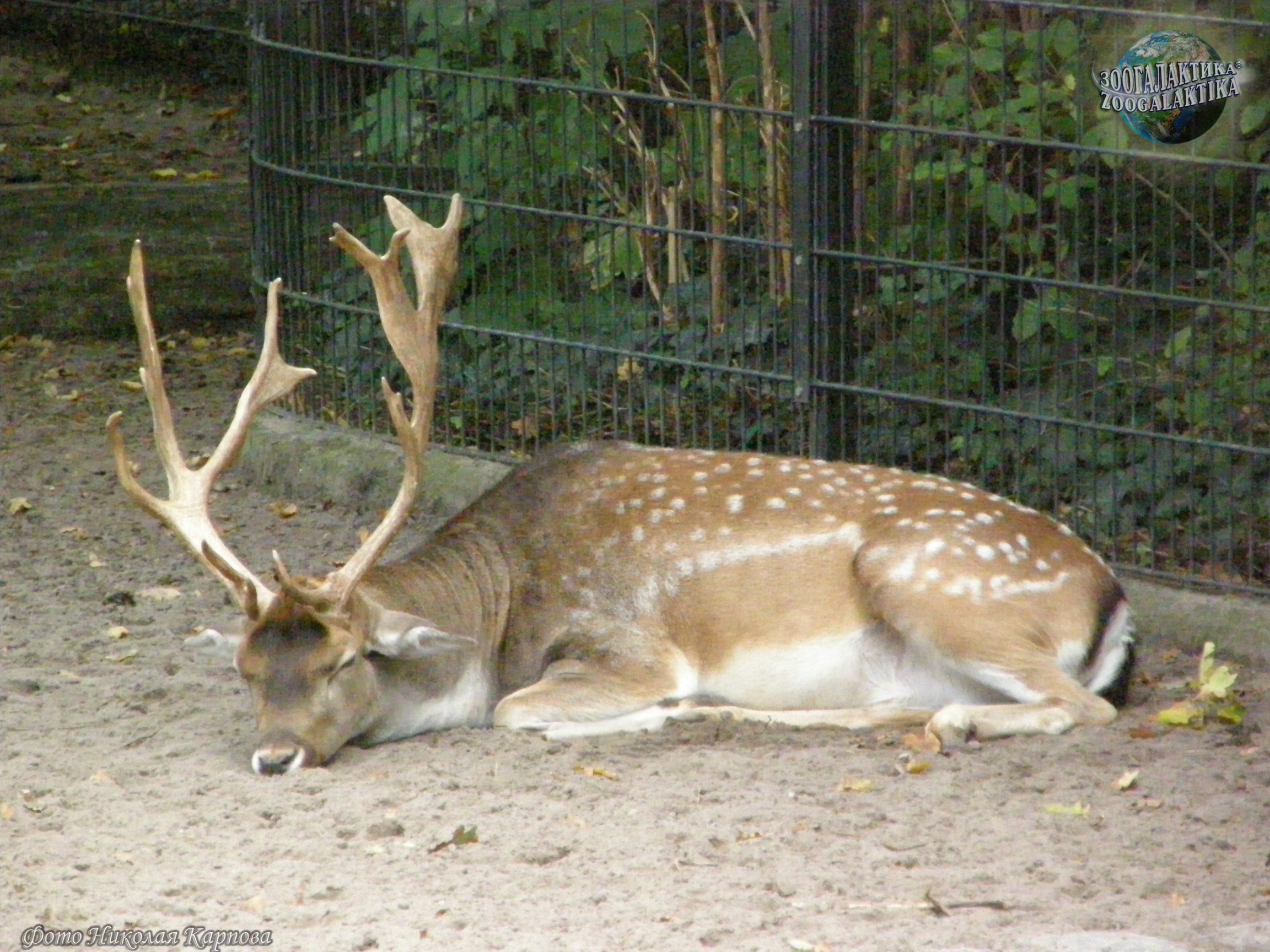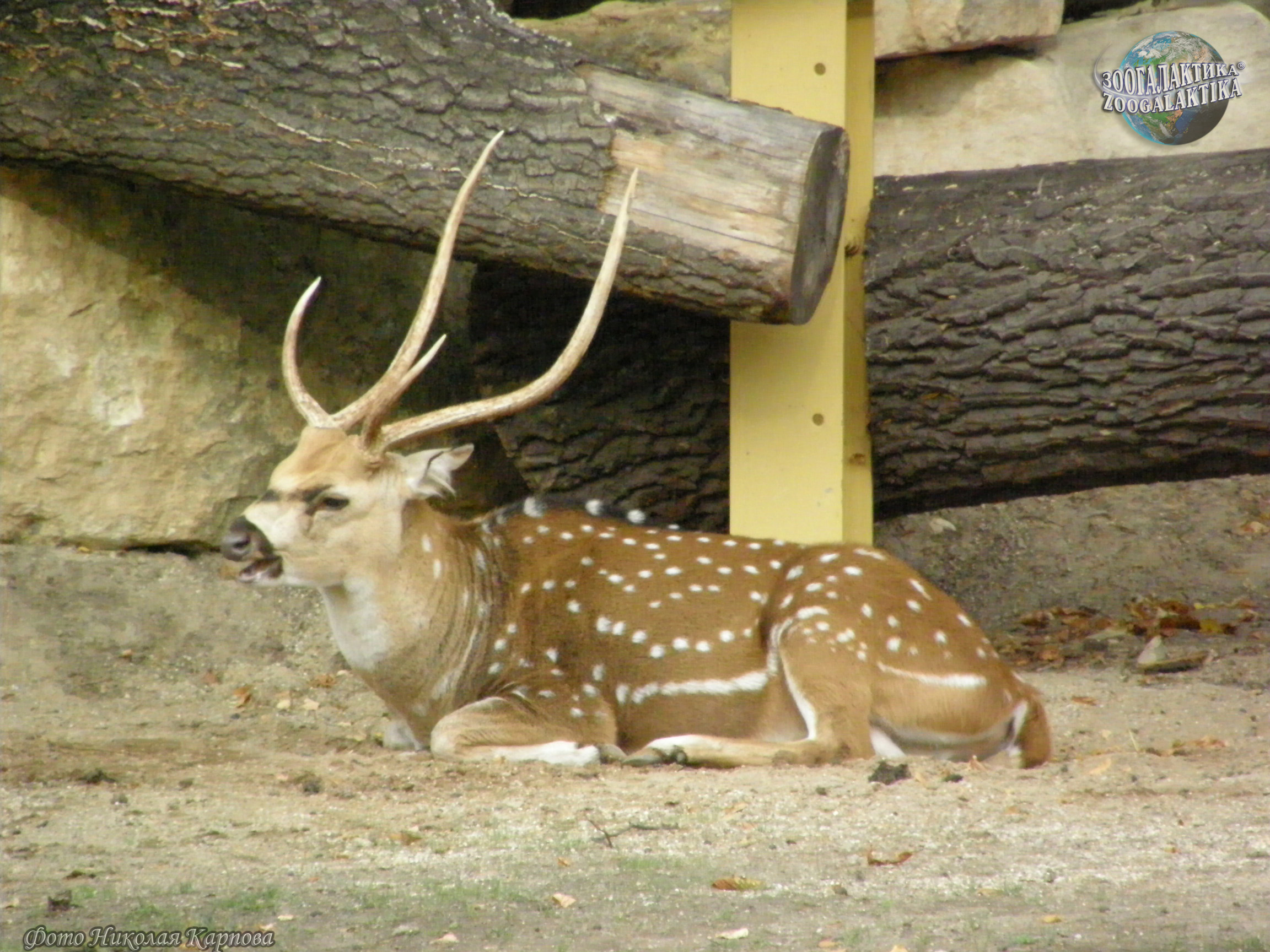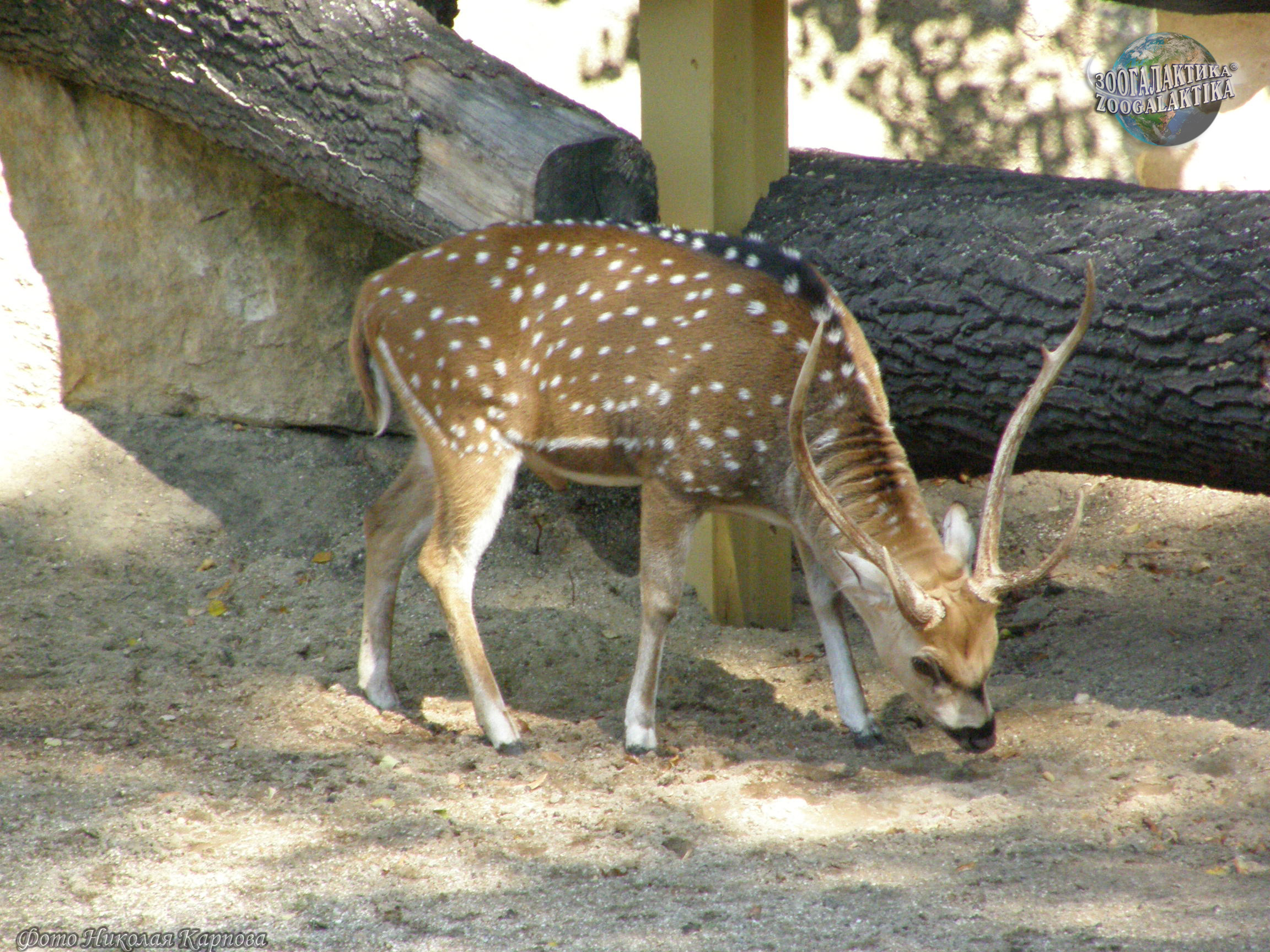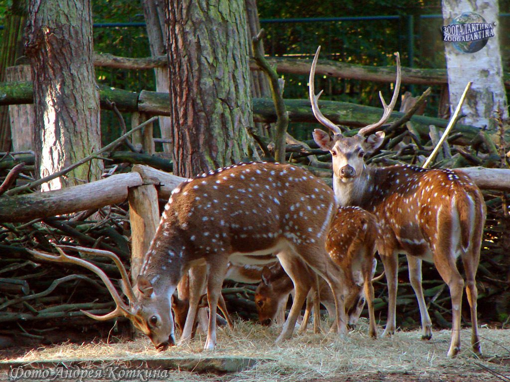 Аксис (Axis axis) - изящный олень с рыжевато-золотистым окрасом шерсти, на котором разбросаны мелкие белые пятна. Длина его тела достигает 150 см, высота – около 100 см, вес до 80 кг. У самцов аксисов ветвистые, с длинными лобными отростками рога.